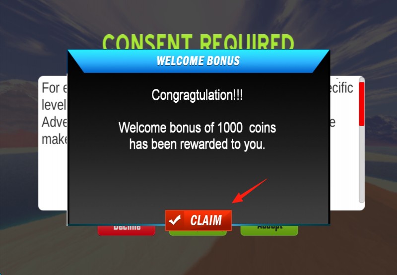 - 点击“claim”,领取1000coins欢迎奖励,用于游戏消费。