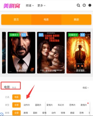 切换至电影页面,支持按动作片与喜剧片等类型筛选,查找疾速追杀4等影片。