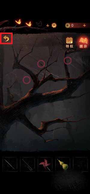 3、需要注意的是,如果(ruguo)你进入了下一级的画面(huamian),如下图,需要先点击(dianji)左上角的“返回”再点击(dianji)上图的黄箭头完成爬树。