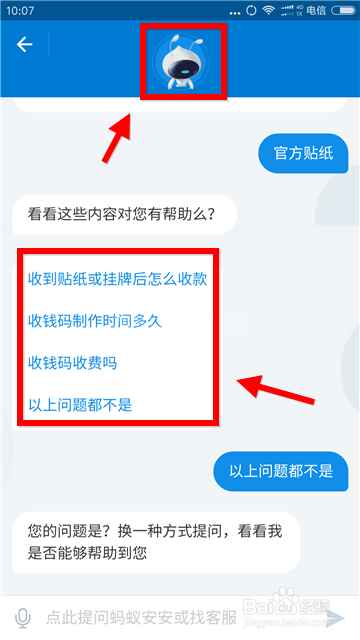 进入客服页面后,一开始和我们对话是机器人客服蚂蚁安安。