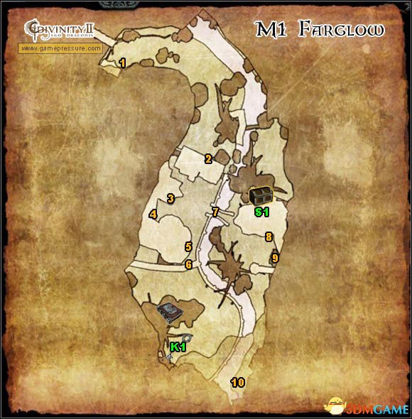 2. 学到读心后,对拱门前的Edmund读心可以在训练场的火堆里找到钥匙1(K1).箱子1可以刷装备(龙骑士)或者配方(龙裔).