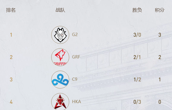 目前A组的形势比(bi)较明朗,不出意外就(jiu)是(shi)G2战队(zhandui)姒彶GRF战队(zhandui)晋级出线。