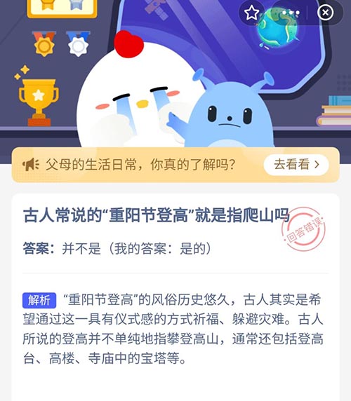 古人常说的重阳节登高就是指爬山吗(古人常说的"重阳节登高"就是指爬山吗)古人口中常说的重阳节登高就是指爬山吗,在今天的支付宝蚂蚁庄园中,关于重阳节登高是否要爬山的问题,想知道正确答案的小伙伴们,大家可以看看接下来的内容。