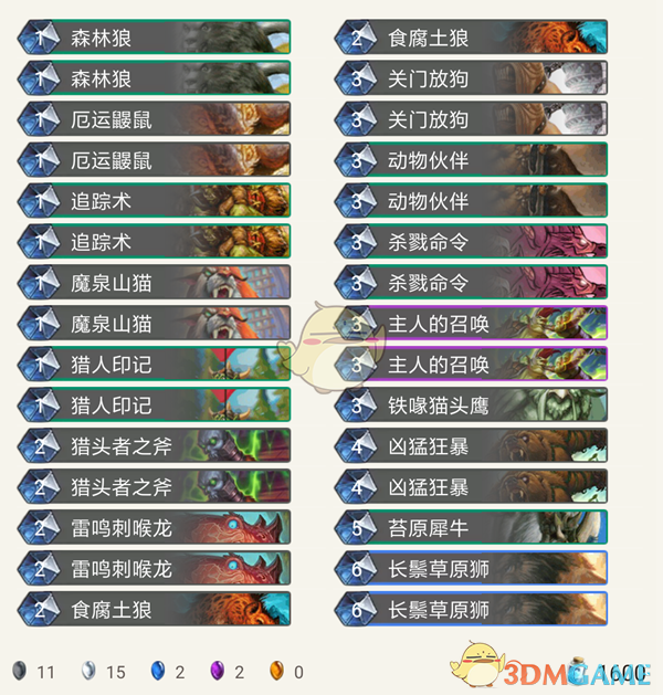 前期填补水晶缺口,不管是一次出两张或是配合其他随从一起出,节奏很(hen)强(qiang);中期拼场面最好的选择是动物伙伴,本身体质就好,这时候费用也足够下3+3;后期想斩杀选低费用,想给压力选高费用。斩杀选低费用森林狼或放狗都不错。如果是给压力的话,唯一的选择就是长鬃草原狮了,每回合下一张压垮对手。