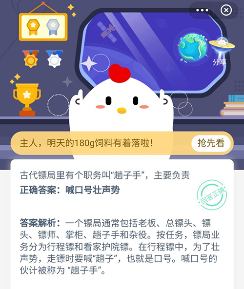 古代镖局里有个职务叫趟子手主要负责(古代镖局有个职务叫趟子手主要负责什么)有小伙伴知道“趟子手”的主要工作是什么吗?在镖局中处于什么样的工作地位?在今天的支付宝小鸡答题中就问到大家这样一个问题,这里还有更多内容可以看看下面的介绍。