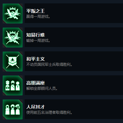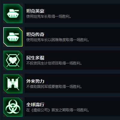 以上3个成就,应该是使用除了坦克车长和开发商以外的角色(juese),前五张图都困难难度打过一遍就可以解锁的(军阀算不算不清楚,因为我都打了,建议可以放在最后打)