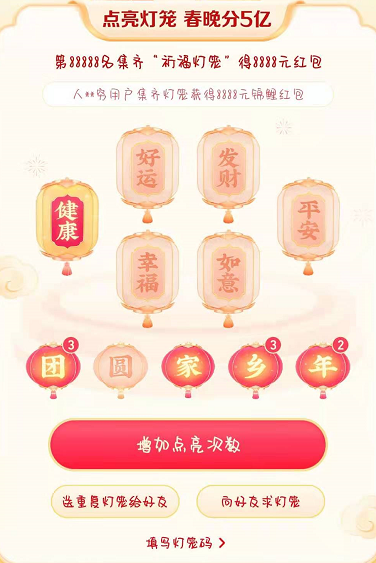 今年抖音需要(yao)收集到五个灯笼,分别是“团、圆、家、乡、年”,然后(hou)再合成“好运、健康、发财、幸福、如意、平安”,但(dan)是(shi)想要得到“圆”子灯笼还是(shi)很难的,可以通过增加点亮灯笼的次数或者是向好友求灯笼来得到。