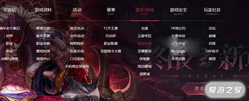 1、玩家前往DNF官网,选(xuan)择上方的服务/商城在下方可以找到(zhaodao)角色恢复功能页面。