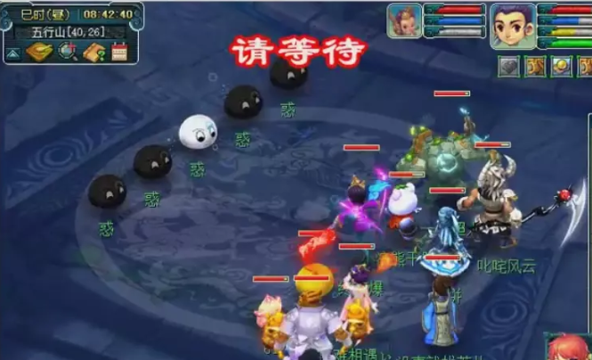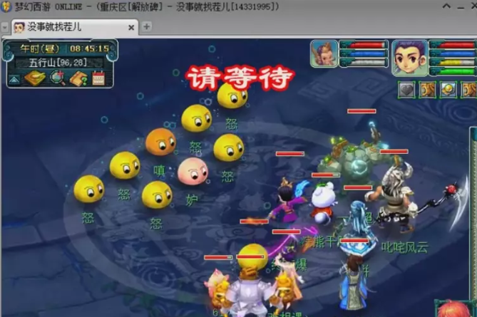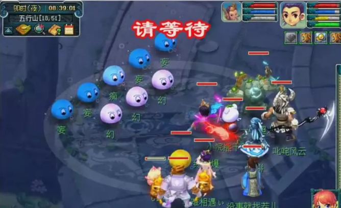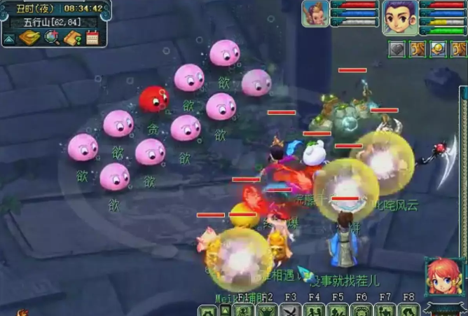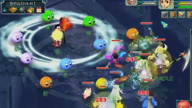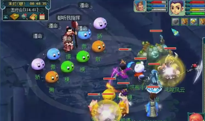 蓝色泡泡(傲)为天宫,伤害较低,会使用天雷斩和雷霆万钧。白色泡泡(骄)为ST,伤害较高,会使用狮搏,象形,鹰击。绿色泡泡(横)为DT,伤害较高,会使用横少千军和后发。橙色泡泡(懒和散)为化生,不会攻击只会加血。主怪无敌(di),小怪死完会逃跑。