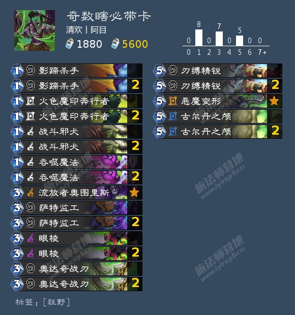 上面给出的每张单卡几乎全是奇数瞎的核心,可以放心大胆的说,带上噬月者巴库,再带上上面所有的牌,再另外随便从中立卡里挑一些低于等于5费的奇数费用的精英牌塞进卡组里,这样组成的奇数瞎卡组强度都不会太低。我之所以一直在强调要快,是因为狂野的环境决定的,剩下的那些高费的休眠或者7费9费随从虽然单卡质量很高,但是携带了一是会增加卡流放的概率,再就是可能存在使用古尔丹之颅后无法返场的后果。这些因素在前面每一回合都很关键的狂野模式都是很致命的,我们玩流放体系作为核心,那么就要遵从一个字,快。(劝退别人快,劝退自己也快)