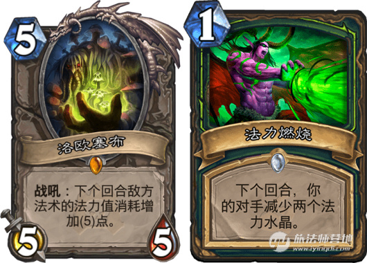 洛欧塞布和法力燃烧这两者作用相似,都是卡对手的节奏来幇莇自己返场或者抢血。不同的是洛欧塞布偏向于中期,自身也是不错的一个站场随从。而法力燃烧在游戏早期就能幇莇你滚雪球,我给出的卡组里没带后者,如果你不想合狂野的洛欧塞布,可以选择用法力燃烧代替这个卡位也是不错的选择,它更灵活,也更能填补费用的空缺,在前期有场面的时候卡住对手的一个回合,在快攻内战是非常致命的,还有一个用处是卡对手变身各种英雄牌的费用。