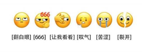有六个新表情,意思分别为【翻白眼】、【666】、【让我看看(kankan)】、【叹气】、【苦涩】、【裂开】
