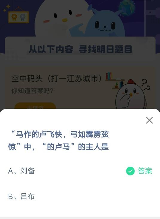 “马作的卢飞快,弓如霹雳弦惊”中,“的卢马”的主人是(“马作的卢飞快,弓如霹雳弦惊”,的卢马的主人是)答对后能领取小鸡饲料,今天的问题是【“马作的卢飞快,马作的卢飞快 弓如霹雳弦的卢马的主人是弓如霹雳弦惊”中,想要了解更多的玩家们快看看下面“马作的卢飞快,弓如霹雳弦惊”中,“的卢马”的主人是的内容吧。