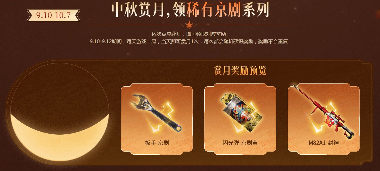 9.10-9.12期间,每天游戏一局,当天即可赏月1次,每次都会随(sui)机(ji)获得奖励(jiangli),奖励(jiangli)不会重复