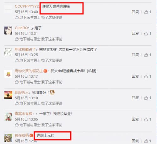 许愿是DNF所衍生的游戏文化之一:玩家为了能刷出游戏中的史诗装备,经常会在微博、贴吧、视频等评论弹幕中许愿刷出史诗装备,如:“许愿清泉流响”、“许愿启明星”等。如果你哪天在看视频的时候发现弹幕上出现了相似的字眼,那一定是某个勇士在为了自己的装备而努力着。
