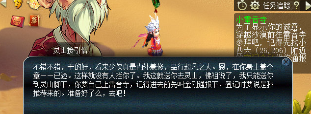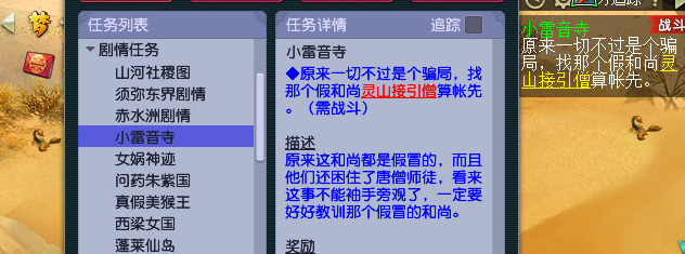 原来一切都是骗局,而且还困住了唐僧师徒,看来这事不能袖手旁观了,要定要好好教训那个假冒的和尚。找到灵山接引僧(大唐境外16,106),直接切入战斗,战斗难度不高,对面的怪有感知小怪随机门派,如果小号比较脆,还是得稍微注意一些,可组上辅(fu)助或者带好救人药。战斗结束获得450000经验。