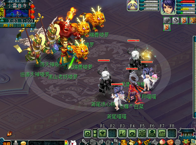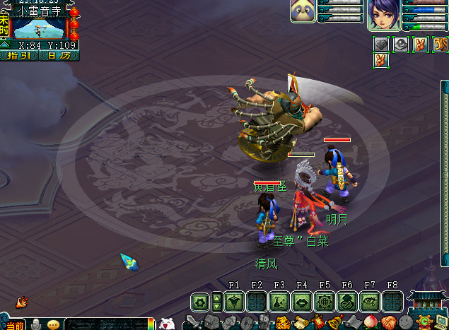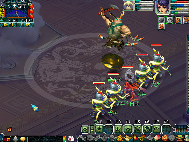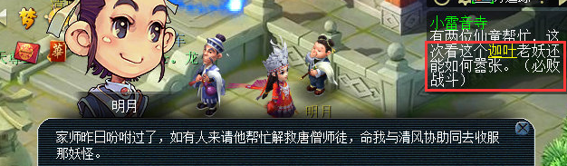 接引僧说是三年前,一个妖怪从东而来,法力高深,还带着一个白色的袋子和一对金饶,举手之间就将和尚打败,然后在后面(houmian)的山头建了小雷音寺,并命他在此骗取有灵性之人前去给他食用提升(tisheng)道行。先去找玉皇大帝(凌霄宝殿24,40)看看是不是天上什么星宿神兽下凡闹事,玉帝派了一群天兵天将助阵陪着一起去杀回来。回到小雷音寺,找到迦叶直接开打,没想到天兵瞬间被秒飞。必死战斗,【建议不带宝宝不带队友】,死亡无损失。