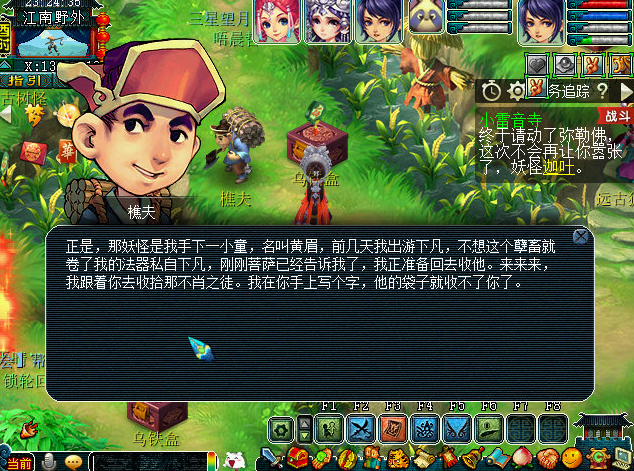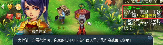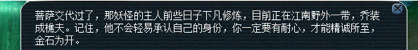 前往普陀山找青莲仙子寻求帮(bang)助。清莲仙子让你去寻找江南野外的樵夫(江南野外133,24),结果竟要一颗九转回魂丹才答应帮忙。原来樵夫也是一位三界中隐藏的大能啊。樵夫居然就是弥勒佛,而黄眉怪则是他坐下的童子。他在你手中写下了一个字,黄眉怪的法宝对你不再起作用了。然后再去小雷音寺前往击杀黄眉怪。本场战斗是最后的决战,对面的怪有感知小怪随机门派,战斗结束后获得450000经验,超级金柳露一枚以及人物等级-20的铁一块,2点成就。至此,小雷音寺剧情完结。