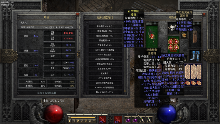 图中我的(de)戒指不太合格,没有力量、生命等属性。如果装备比较極限,生命值可(ke)以(yi)接近3000。如果使(shi)用法杖底材战争召唤,生命可(ke)以(yi)轻(qing)松(song)超过3000。