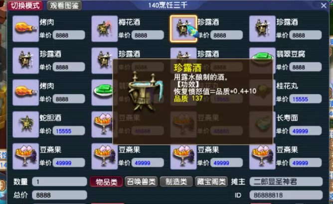 第一种,常规的卖烹饪,主要是给做师门和跑环的人,这两项都有品质要(yao)求,还得是高烹才好卖。
