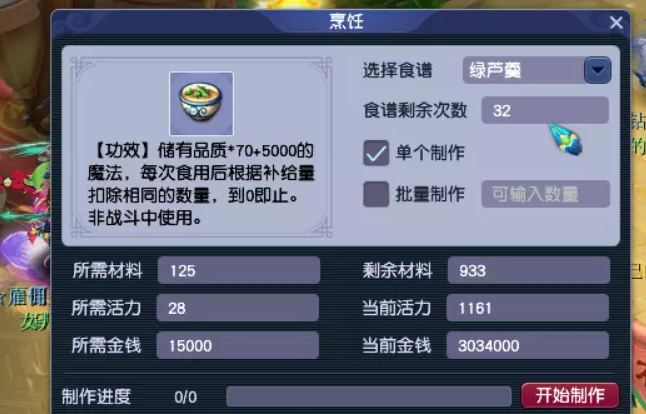 然后第三种就是高级烹饪了,我每次上号打完符以后,剩余的活力都做成烹饪扔这里了。