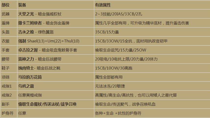 所以天堂之光的孔数比3技能更重要,优先选2孔天堂,一般(generally)镶2个Shael(13),也可以1个Shael(13)+1颗IAS/DTM珠宝。