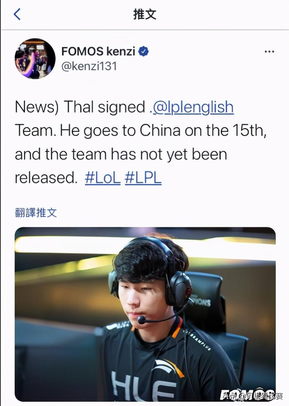 最后依然是来自这位LCK记者的爆料,表示前SKT上单Thal即将加入LPL,他将会在15号去到中国,具体是哪一支战队(dui)还没有公布。说实话这个有点没想到的,因为Thal这几年在LCK打得并不是很好,LPL最近竞争(jingzheng)力也很强,很多(duo)人(ren)感觉(jue)没必要花钱请一款不够出色的外援,当(dang)然如果真的来到了LPL,还是希望Thal可以发挥出惊艳的表现吧!