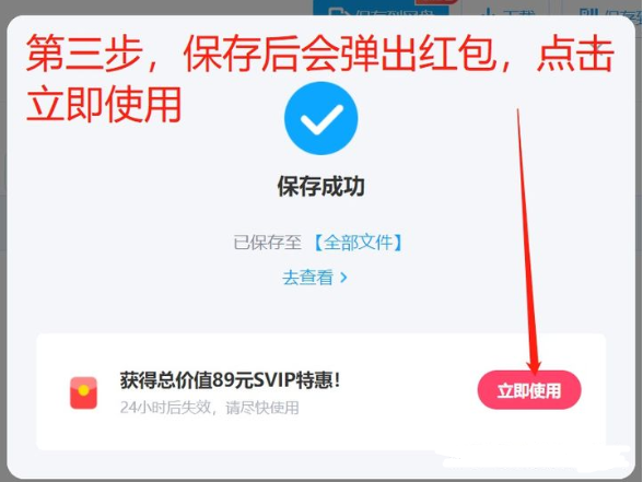 保存文件后,会弹出红包,用户点击“立即使用”。