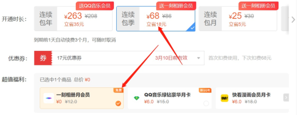 领取红包之后(after),付款页(ye)面(mian)中能(neng)够(gou)发现年卡、季卡、月卡优惠的价格,目前年卡和季卡,可以获得绿钻和一刻相册会员。