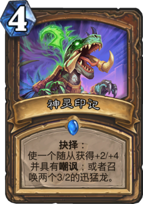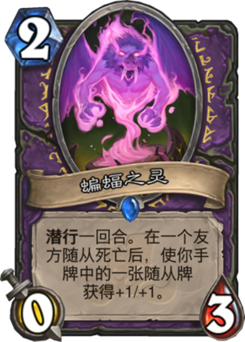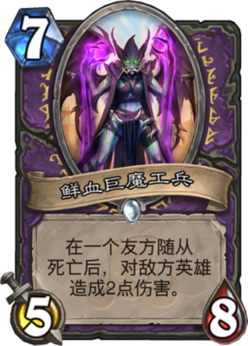 758还是亏了一些身材的,这张牌感觉有点不伦不类,效果明显是快攻的,但费用太高,还需要随从死了才能发挥(to play)效果,如果没有想到配合的套路的话,应该是没什么出场机会的。