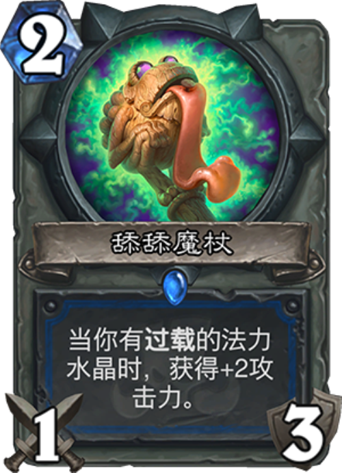 最后一张被打1分的是萨满的舔舔魔杖,名字是非常有意思的,而效果说实话也不错,一个过载可以让他两回合都得到加2攻的属性,但问题就是现在过载萨不怎么流行,这张牌也被连累了。