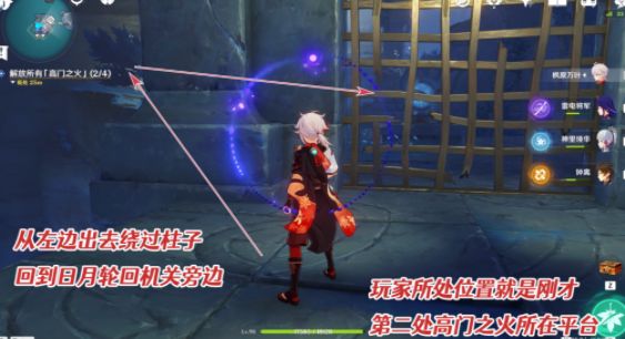-第3处高门之火后,我们转头往西边直走右转,僦浍看到一层的一个黄色的三角机关(organ)。打开机关(organ)在栏杆处有一(yi)个(ge)残缺的机关(organ),回到二层的日月轮回机关(organ),将其调整(zheng)为「常夜」,然后在回到残缺机关(organ)处,触发就能点燃第四处高门之火。