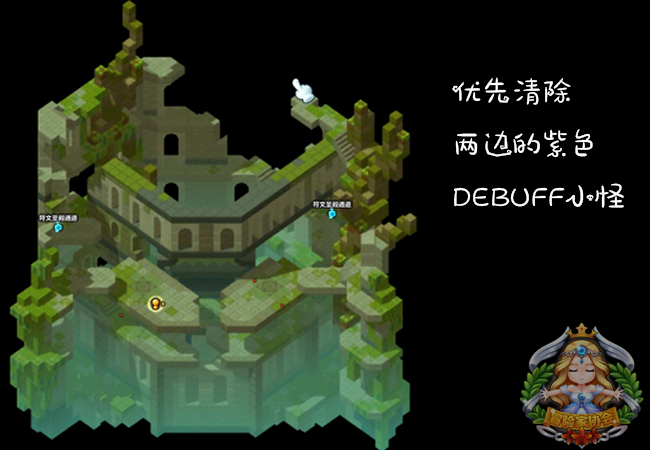 这里的符文通道共分为6个点,均有小怪分布,小怪可使玩家在12秒内的攻击力降低一定百分比,最多叠加3次,具体站位如下图所示: