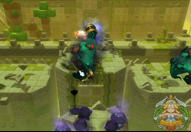 当罗尼塔的血量达到一定阶段时,会将右手放在中间,形成一个风卷,此时玩家全部到中间,吸8名玩家到手中,同时中间形成一个台阶,其余的玩家则需要跳至台阶上击打罗尼塔的眼睛且造成一定伤害,否则手上的8名队友將會一命呜呼~