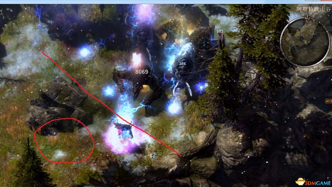 这(zhe)个卡怪点很重要,很重要,很重要!因为真的很重要所以说3次,在这(zhe)个地(di)方(fang)老莫的雷球会被石头卡掉,但是你却可以越过石头打到他!而且在这(zhe)个位置兽群只有(you)最多3只能摸到你,把兽群卡在这里迅速清理掉,然后移动到红色圆圈处输出兽神,,而且我发现兽神的雷球远程有时候是可以直接打掉的,在这里输出只有(you)安逸两个字可以形容。但是要注意的是有一种情况是如果你前面的曲线拉怪没能清掉大部分怪的话,荆棘兽有几率在红圈的位置放一个藤蔓,这就很烦,因为被减速老莫走近一套是很难躲的,而且藤蔓伤害也很高,如果他再次(ci)召唤被兽群围住也很难走,所以前面的曲线拉怪一定要做好。
