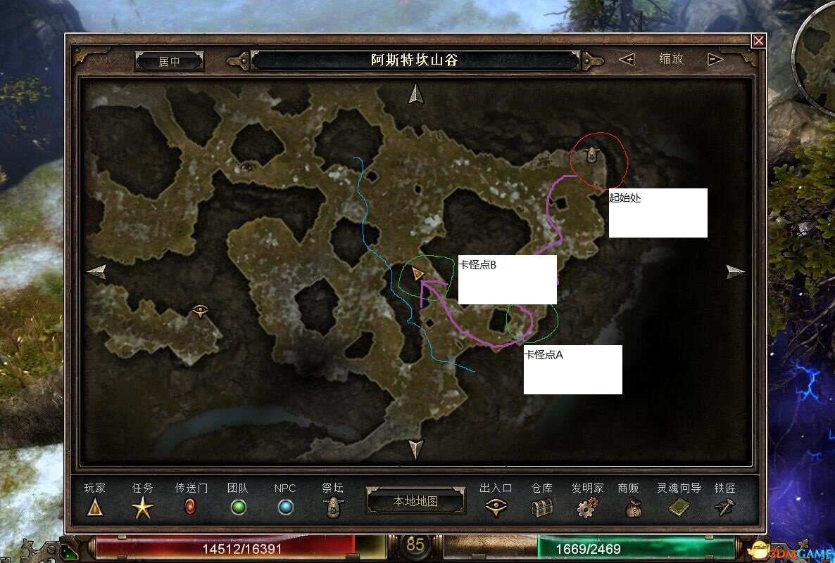 图里红线圈出的是兽神的起始位置,蓝线是兽神的仇恨值清零的范围,也就是说超出这(zhe)个范围,老莫就不会再追你,而是跑回祭坛处,绿色圈出的是两处绝佳群怪/卡掉老莫雷球的地点,紫线是整个拉怪的路线。