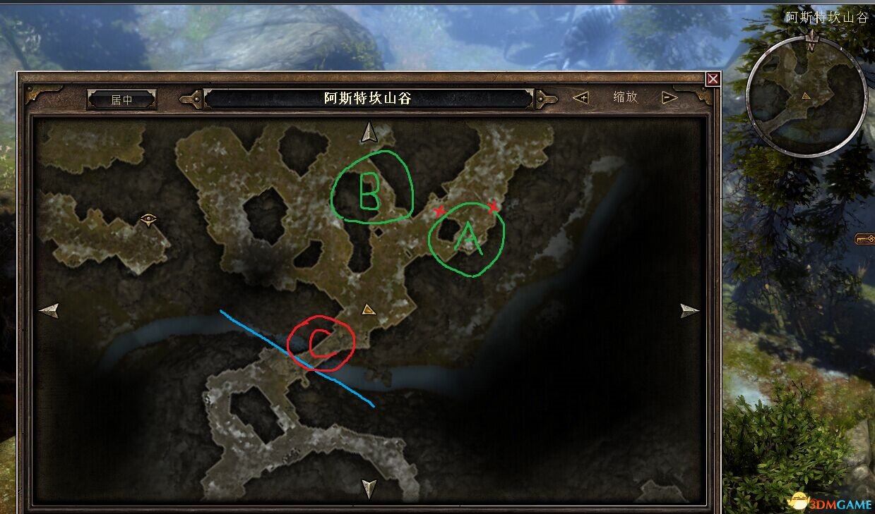 紫色代表新的拉怪路线,这次我们不往B点走,而是把兽群往下方的桥处引,烸佽老莫超出仇恨范围撤退之后我们就开一个传送门传回家,然后再传回来,如此反复数次,当然你运气好的话一次就行了,老莫的初始位置就会发生变动,这(zhe)个就是我们接下来战(zhan)斗的基础