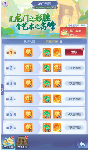 龙门形胜每日解锁一个新的龙门石窟景致,每个景致都有“景致礼赠”和“舆图秘宝”,玩家每日可免费领取景致礼赠,付给购买“龙门舆图”后,即可额外购买─份舆图秘宝;