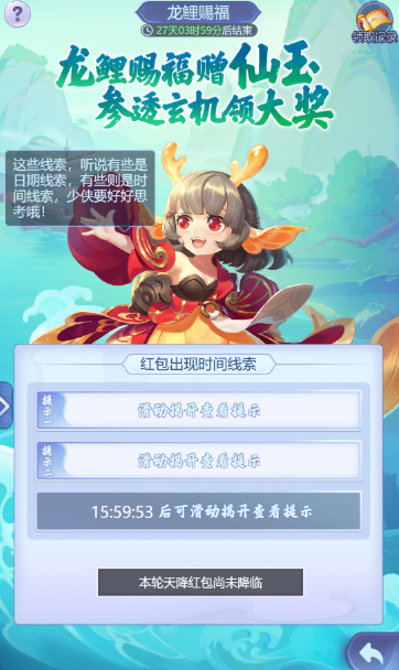 活动期间每周将有10分钟出现天降红包,期间登录游戏即可领取海量仙玉。同时将提供(supply)三个线索供玩家参透天奖红包的出现具体时间,与三五好友—起研究线索吧!
