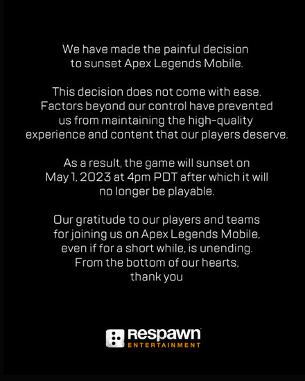 apex手游5月停运是真的吗内容及配图由入驻作者撰写或者入驻合作网站授权转载。文章观点仅代表作者本人,不代表本站立场。apex手游5月停运是真的吗文章及其配图仅供学习分享之用,如有内容图片侵权或者其他问题,请联系本站作侵删。