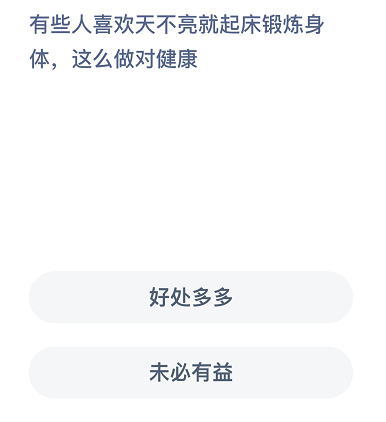 有些人喜欢天不亮就起床锻炼身体,这么做对健康这么做对健康?这是今日的蚂蚁庄园小课堂的问题,很多玩家都比较关注这个话题,接下来就让小编为大家详细介绍一下,需要的小伙伴可以看看下面的内容。