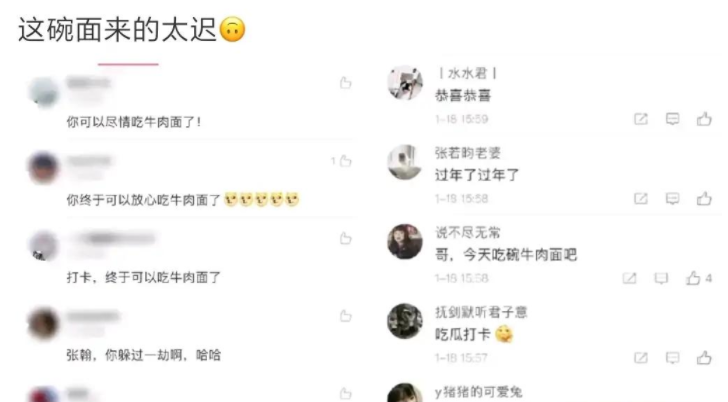 张翰吃牛肉面这个梗其实在很久之前就(jiu)有了,在2015.10.21,当时张翰和郑爽已经分手了,张翰发微博“既然青春留不住,不如来碗牛肉面”,然后(ranhou)遭到了郑爽粉丝的轰击,大致就是郑爽都瘦成那样了你还吃的下,网友称张翰不敢吃牛肉面了。