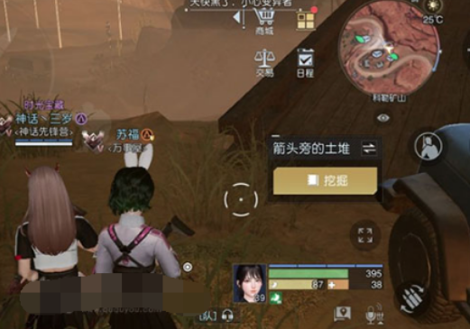 2、之后在汽车旁边找箭头,看到箭头旁土堆,挖崛即可获取藏宝图了。