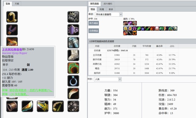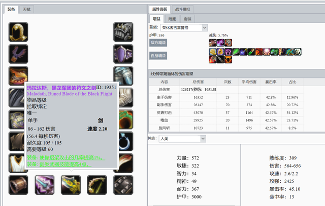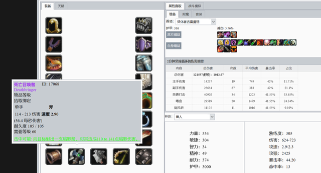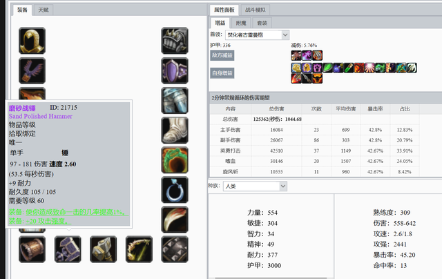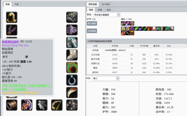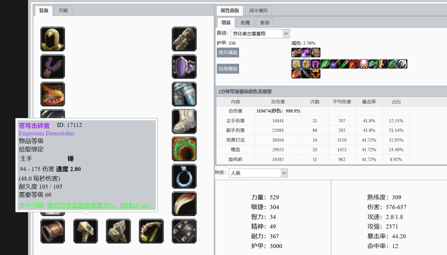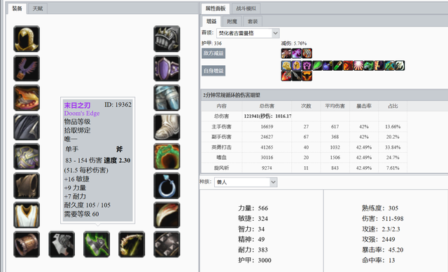 不用多说,兽人战士P4毕业装。这个(ge)数据还需要算上死亡召唤者暗影箭的伤害,哪怕占比只有0.5%,也可以超过混乱+沬ㄖ的组合。
