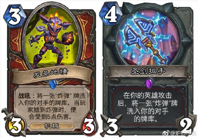 发条地精和圣剑扳手从牌面描述上来看就是"炸弹(dan)"体系中的强力卡牌。发条地精虽(sui)然身材略亏,但是其机械的属性再加上咜哋战吼效果,这张牌可以说非常强大,而且咜哋费用比爆盐投弹手低,非常灵活;圣剑扳手作为一张武器牌攻击力在4费这个费用上显得略低,但是其效果非常imba,这把武器砍完就可以埋两张"炸弹(dan)"牌进入对手的牌库,甚至可以配合"升级!"多洗一张"炸弹(dan)"牌。