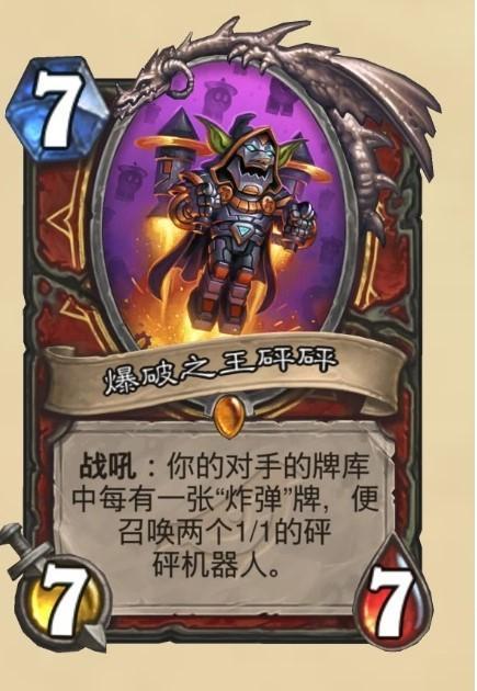 在经历过地精大战侏儒之后几个(several)版本的炉石玩家们一定体会过砰砰博士的两个砰砰机器人(robot)的厉害。除了能够解场以外,砰砰机器人(robot)的伤害打到脸上也(ye)是(shi)很疼的。而爆破之王砰砰很有(henyou)可能一下能够召唤6个砰砰机器人(robot)(对手牌库中三个以(yi)上(shang)"炸弹(dan)"牌即可),对手既要处理场面上的7-7随从和砰砰机器人(robot)还要保证自己的血量不被后面抽到的炸弹(dan)炸死,这可以说是非常困难了。
