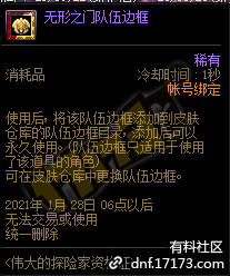 DNF无形之门队伍边框有什么作用(dnf无形之门队伍边框有什么用啊)将该队伍边框添加到皮肤仓库的队伍边框目录,DNF无形之门队伍边框有什么作用添加后可以永久使用。队伍边框只适用于使用了该道具的角色,了解更多内容请看下面。