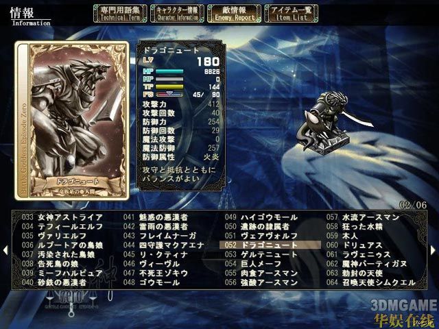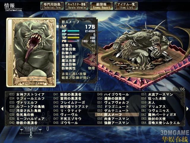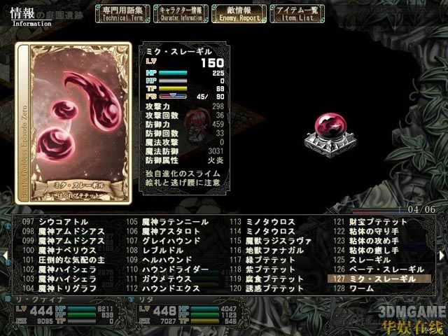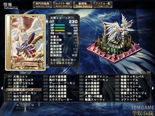5、道具使用。这个我基本没怎么用,但是作用还是很大的。平时体现不出来,对付boss、魔神等硬仗的时候才显出作用。先手吃一个强化药(当然,是辅助给主攻吃,主攻先手就用技能好了),30%的攻击强化不是闹着玩的……,面(mian)对(dui)一群敌人,来不及咏唱魔法的时候,顺手丢一个等待时间短的绘扎,可能就能改变战局。而道具加血也比魔法加血快的多(虽说很浪费,救命的时候就管不了那么多了)。而战斗中武器防具的切换也在道具指令下完成。针对不同(tong)属性怪,及时更换武器,比平时一直装备2个预备武器再切换来的更为便捷实用。