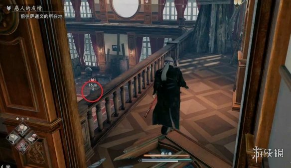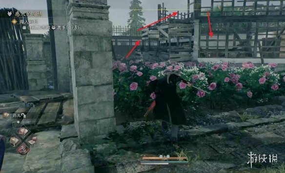 将全部敌人击败往右看,通过右侧的钩爪点跳到上层。