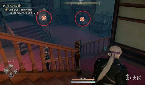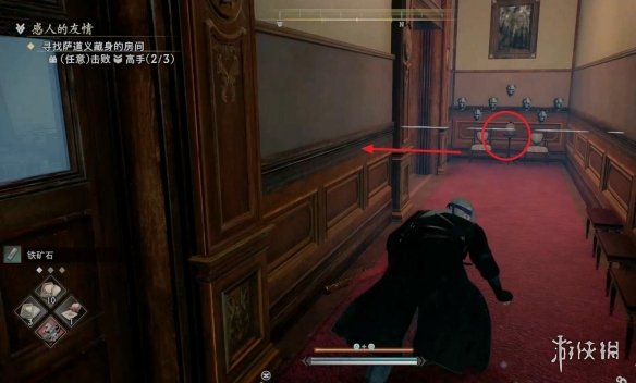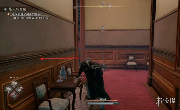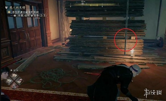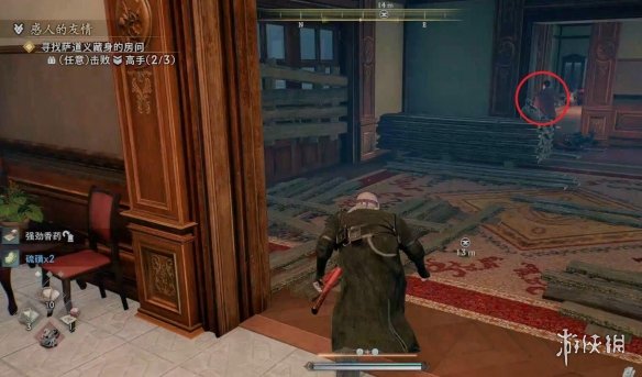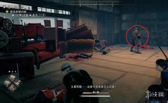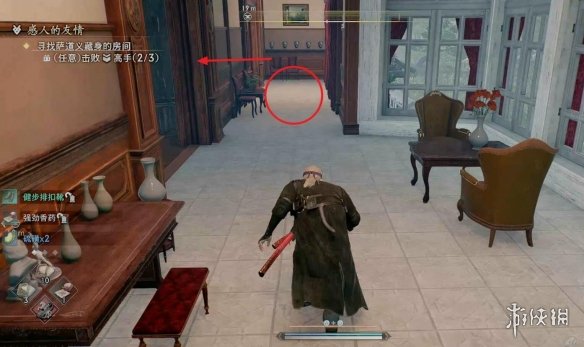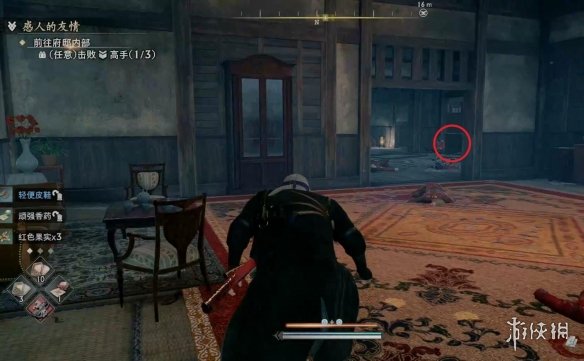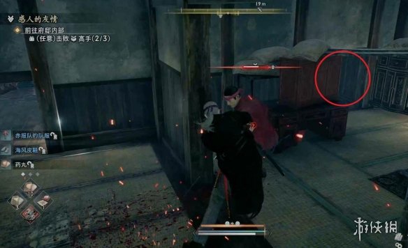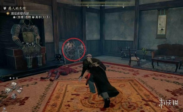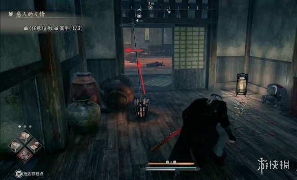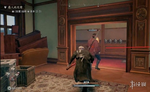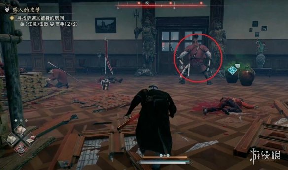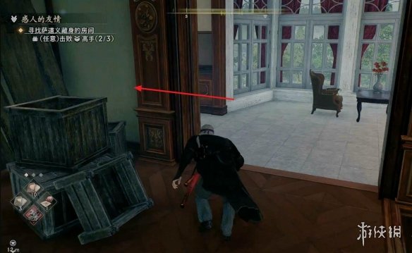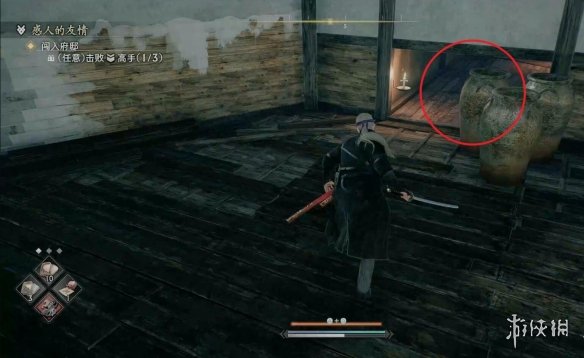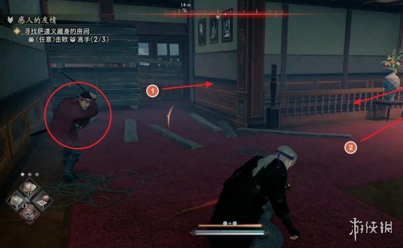 先走到敌人后面将其暗杀掉,注意敌人的身后有一个陷阱。